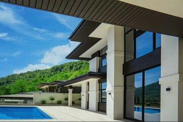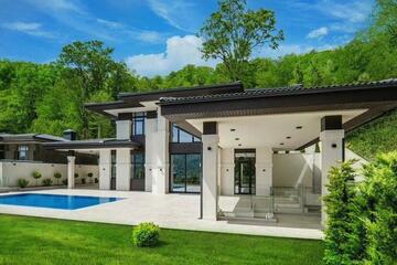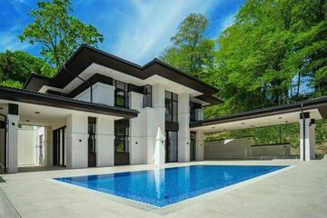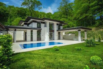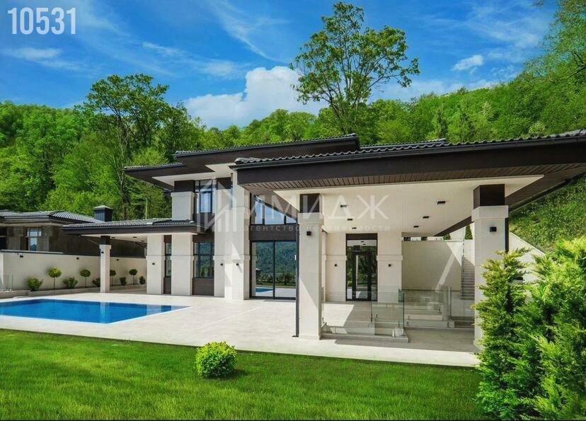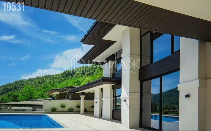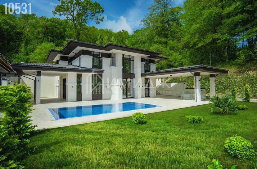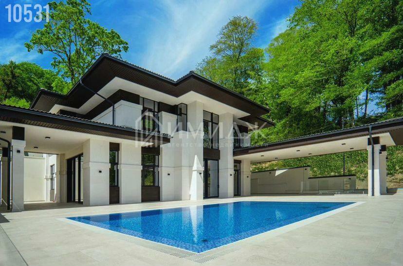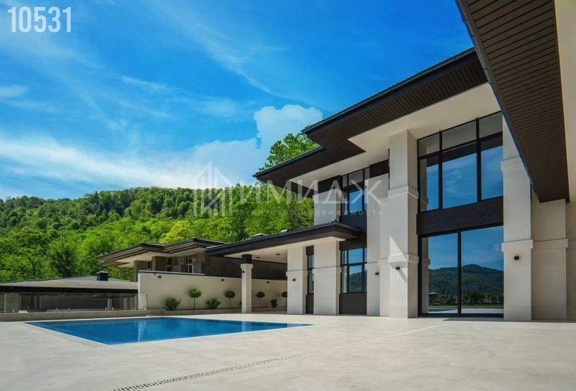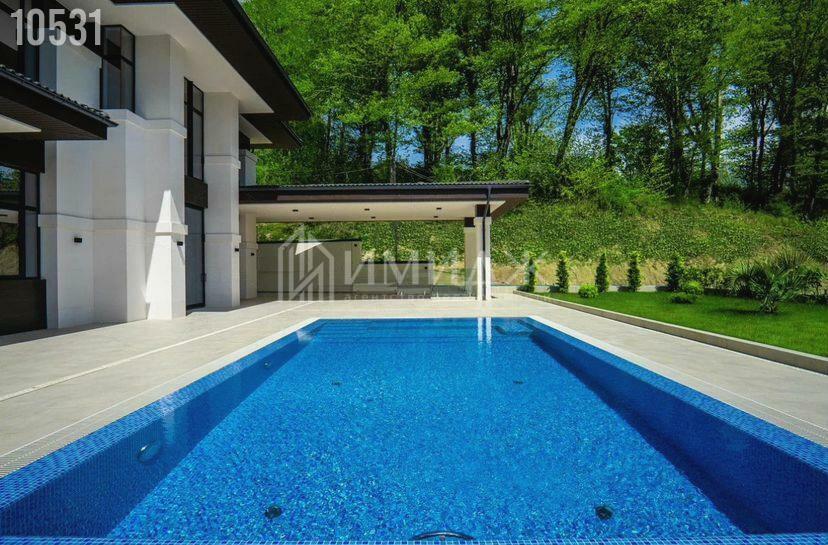 На участке расположились круглогодичный подогреваемый бассейн с противотоком размером 10х4 метра, lounge зона, BBQ, гараж для 3-х автомобилей и спортивная площадка.
